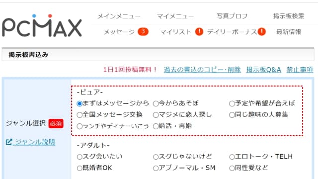 PCMAXの掲示板は上がアダルトジャンルとピュアジャンルの2つに分かれています。